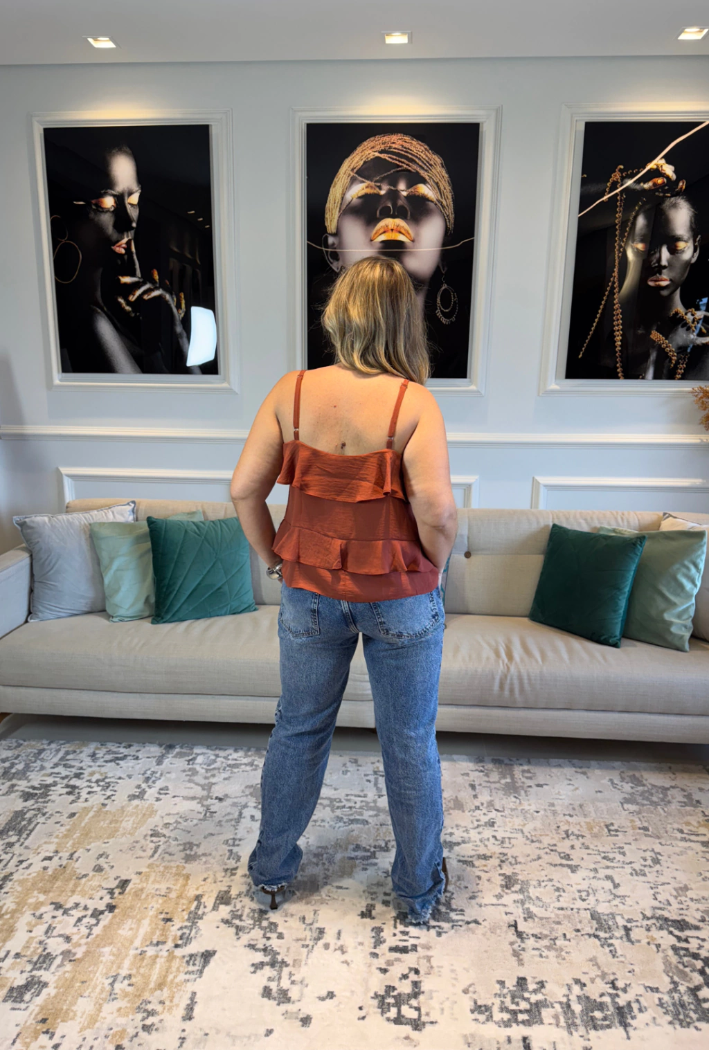 A Blusa Boho Chic Alça é a escolha perfeita para quem ama um visual leve, despojado e cheio de personalidade. Com tecido fluido e babados que trazem movimento, ela é ideal para criar looks com aquele toque boêmio sofisticado que nunca sai de moda.