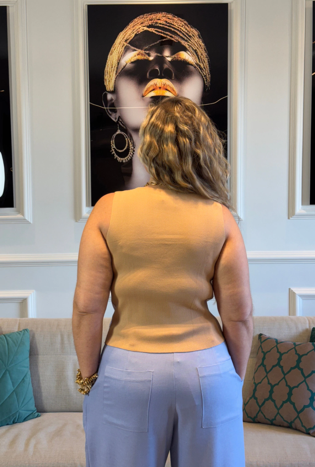 Sem mangas, ideal para sobreposições ou looks de meia-estação