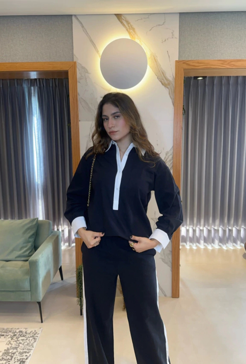O Conjunto Ana Paula é puro charme com um toque de elegância clássica. Composto por camisa de manga longa com contraste em branco na gola e punhos, e calça reta de caimento impecável, ele traz sofisticação instantânea ao look. Ideal para ocasiões formais ou para elevar o visual no dia a dia com estilo e presença.